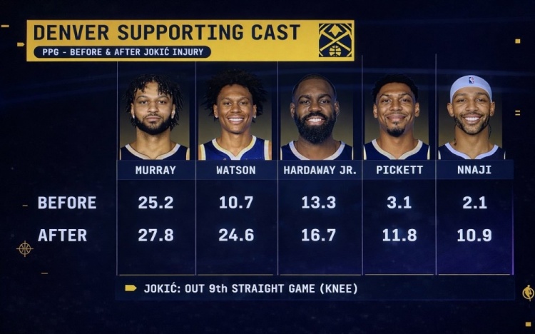 足球比赛直播-队安勿归?约基奇受伤前后 穆雷&沃特森等掘金5将场均得分对比